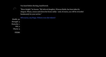 A text-based RPG in which you are a knight, on a quest to save the princess from dragons.